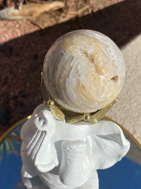 Expertly crafted Druzy Agate Sphere in a beautiful white and beige color. This natural stone sphere showcases the intricate texture and sparkle of Druzy Agate, making it a unique and eye-catching piece for any home décor or crystal collection. Experience the calming and grounding properties of this stunning gemstone.